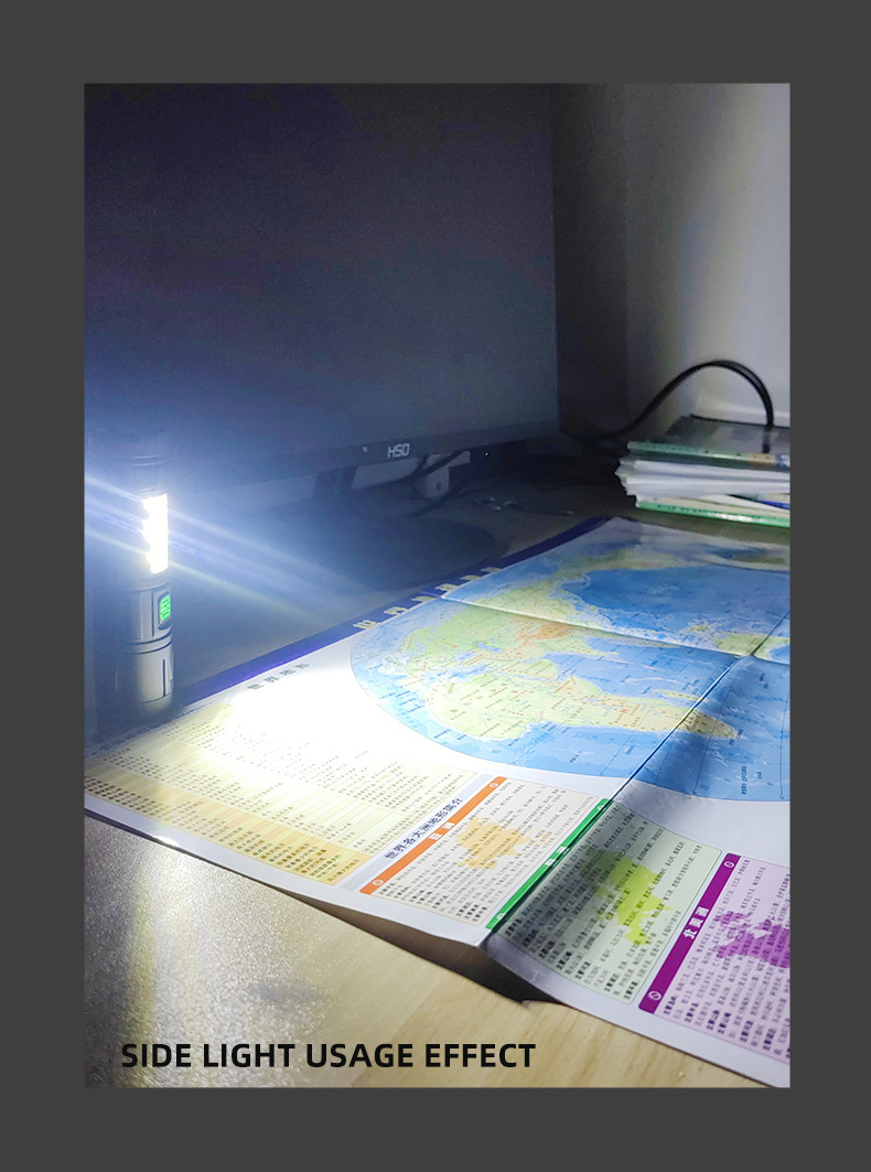 The flashlight has 7 light modes, including main light strong light, low light, and strobe mode, as well as side light strong light, energy-saving light, red light, and red flash mode. The design of this mode meets the lighting needs in different scenarios, whether it is long-distance lighting or warning signals, it can be easily handled.